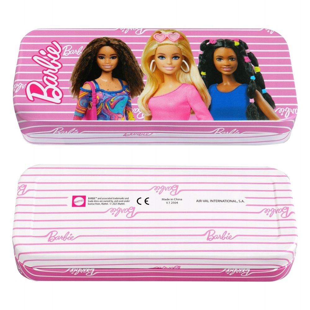 Metalowy tin box w kultowe różowe paski, ozdobiony wizerunkami przyjaciółek Barbie, skrywa aż trzy rozkładane poziomy wypełnione kosmetykami i akcesoriami: