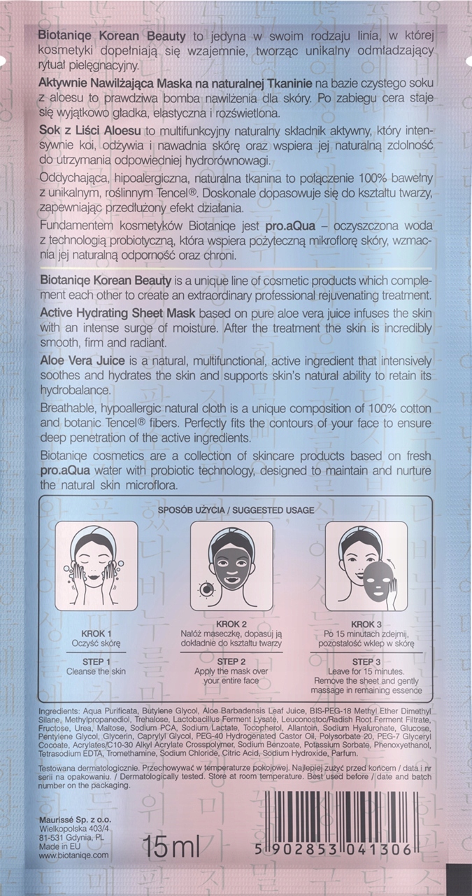 DODATKOWE INFORMACJE O BIOTANIQE KOREAN BEAUTY MASECZKA DO TWARZY W PŁACHCIE AKTYWNIE NAWILŻAJĄCA 15 ML