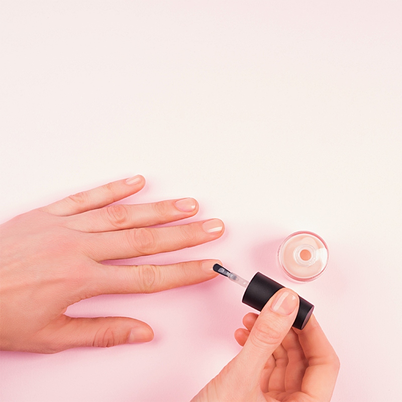 1. Na przygotowany, odtłuszczony paznokieć nałóż cienką warstwę bazy i rozprowadź na paznokciu, np. ruchem wcierającym.