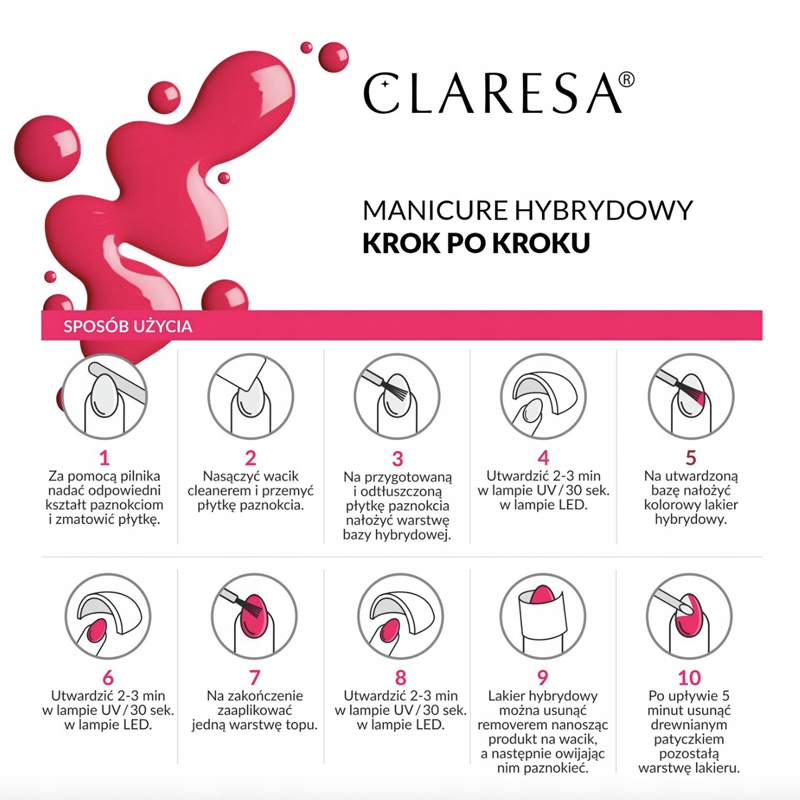 1️⃣ Na wcześniej utwardzoną bazę hybrydową Claresa, nałóż cienką warstwę kolorowego lakieru hybrydowego i utwardź go w lampie UV/LED.