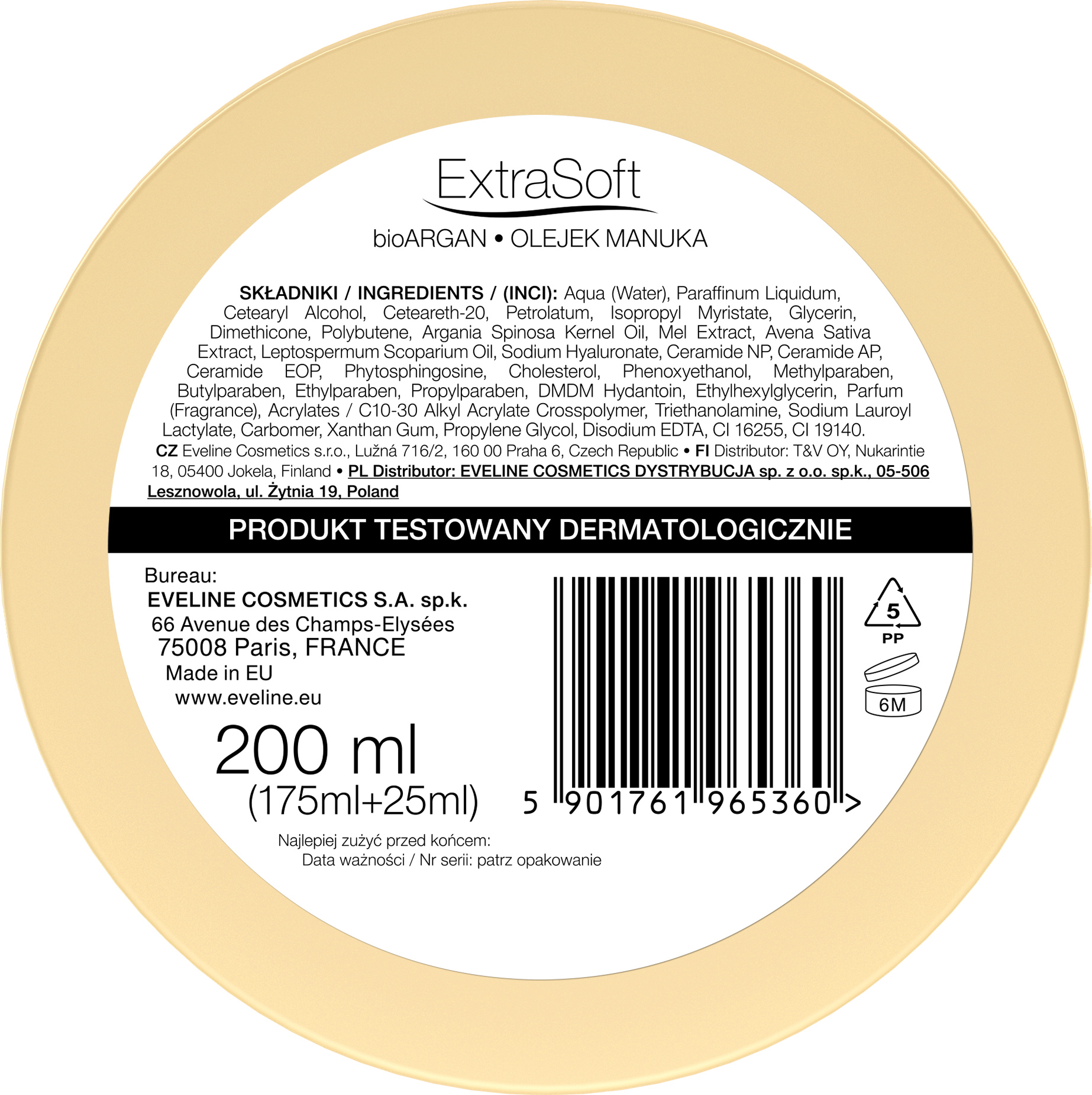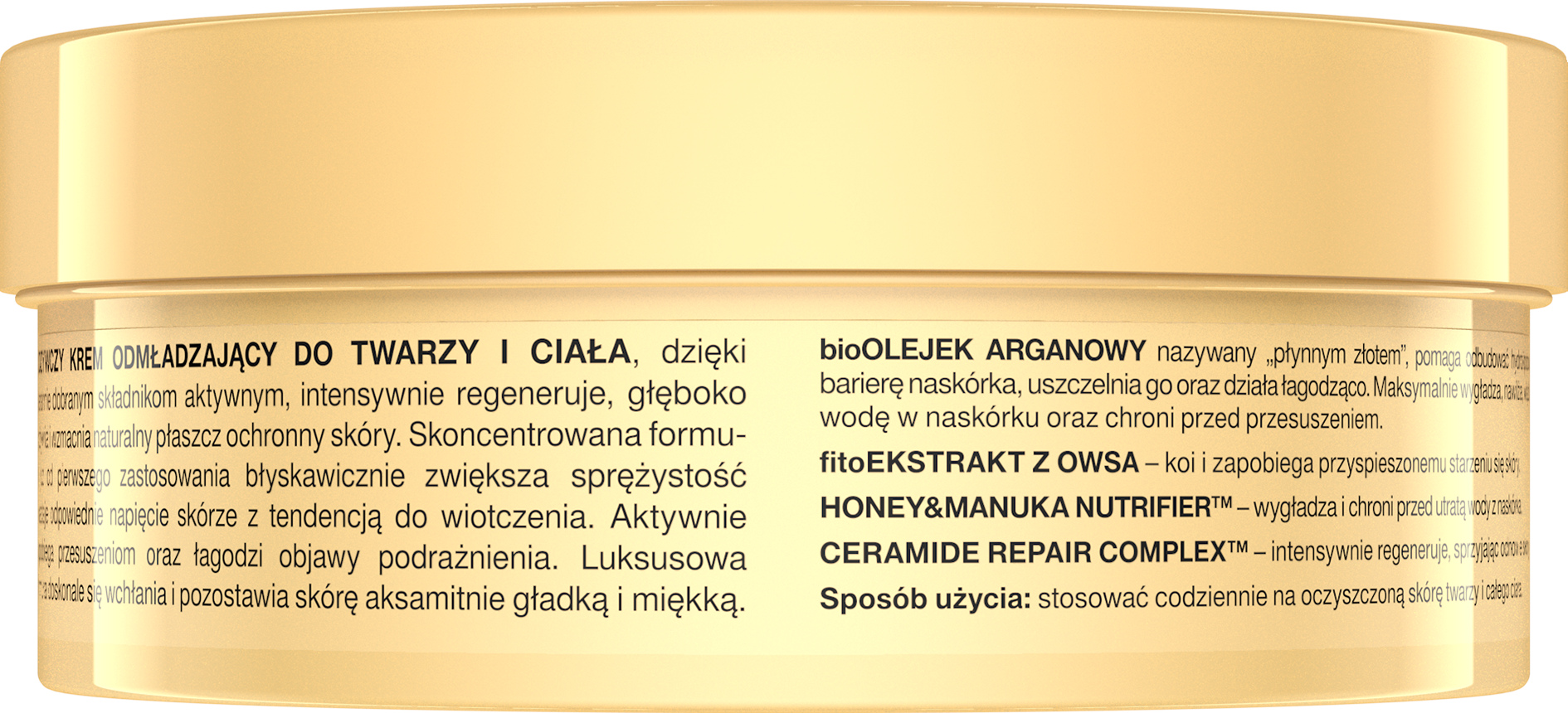BioOLEJEK ARGANOWY nazywany „płynnym złotem”, pomaga odbudować hydrolipidową barierę naskórka, uszczelnia go oraz działa łagodząco. Maksymalnie wygładza, nawilża, wiążąc wodę w naskórku oraz chroni przed przesuszeniem. fitoEKSTRAKT Z OWSA – koi i zapobiega przyspieszonemu starzeniu się skóry. HONEY & MANUKA NUTRIFIER™ – wygładza i chroni przed utratą wody z naskórka. CERAMIDE REPAIR COMPLEX™ – intensywnie regeneruje, sprzyjając odnowie skóry.