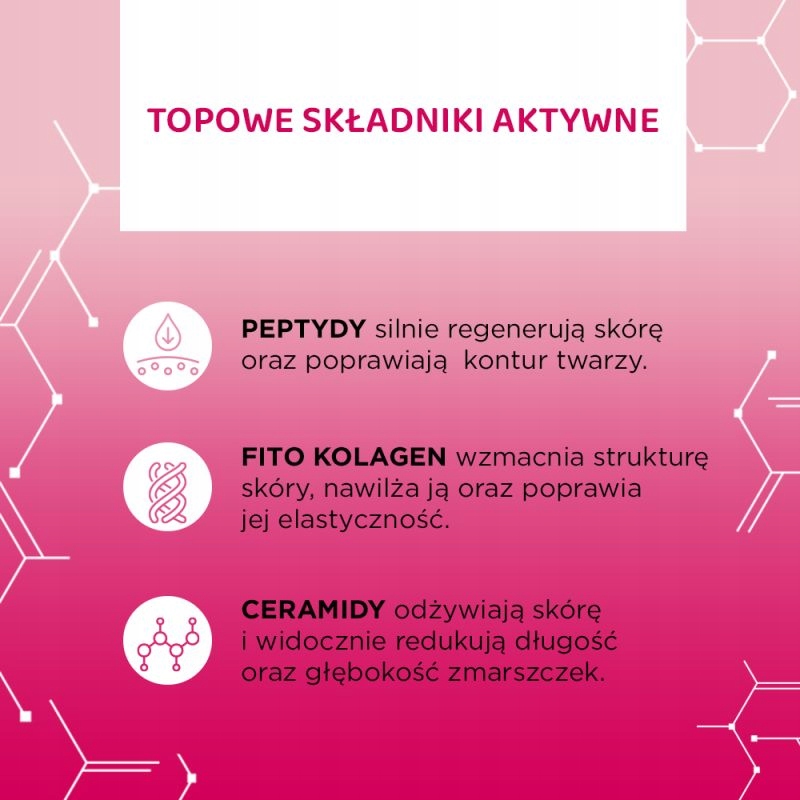 Kolagen to doskonały składnik odmładzający, dzięki któremu widocznie poprawi się elastyczność i gęstość skóry. Ceramidy doskonale pielęgnują i odżywiają cerę oraz spłycają zmarszczki. Doskonale wzmacniają barierę ochronną skóry.