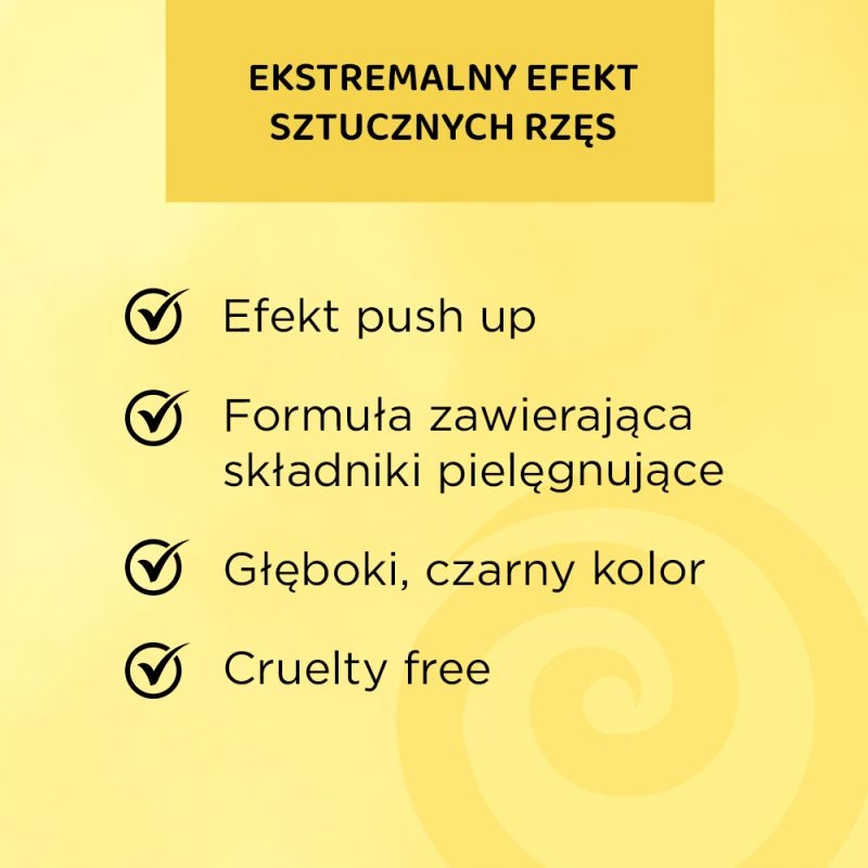 EXTENSION VOLUME PUSH UP VOLUME & CURL MASCARA pozwoli Ci z łatwością uzyskać piękne rzęsy zaledwie kilkoma pociągnięciami szczoteczki. Spektakularny efekt sztucznych rzęs to gwarancja niezapomnianego spojrzenia.