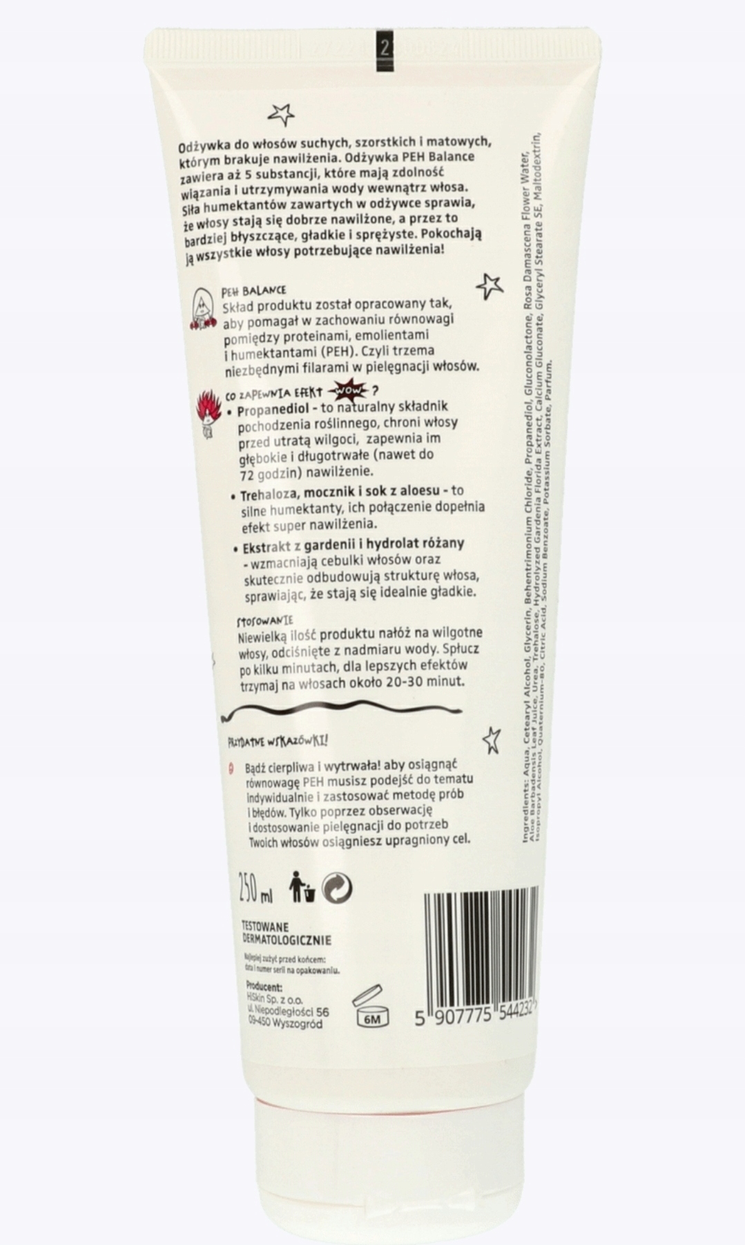 Odżywka do włosów suchych, szorstkich i matowych, którym brakuje nawilżenia. Odżywka PEH Balance zawiera aż 5 substancji, które mają zdolność wiązania i utrzymywania wody wewnątrz włosa. Siła humektantów zawartych w odżywce sprawia, że włosy stają się dobrze nawilżone, a przez to bardziej błyszczące, gładkie i sprężyste. Pokochają ją wszystkie włosy potrzebujące nawilżenia!