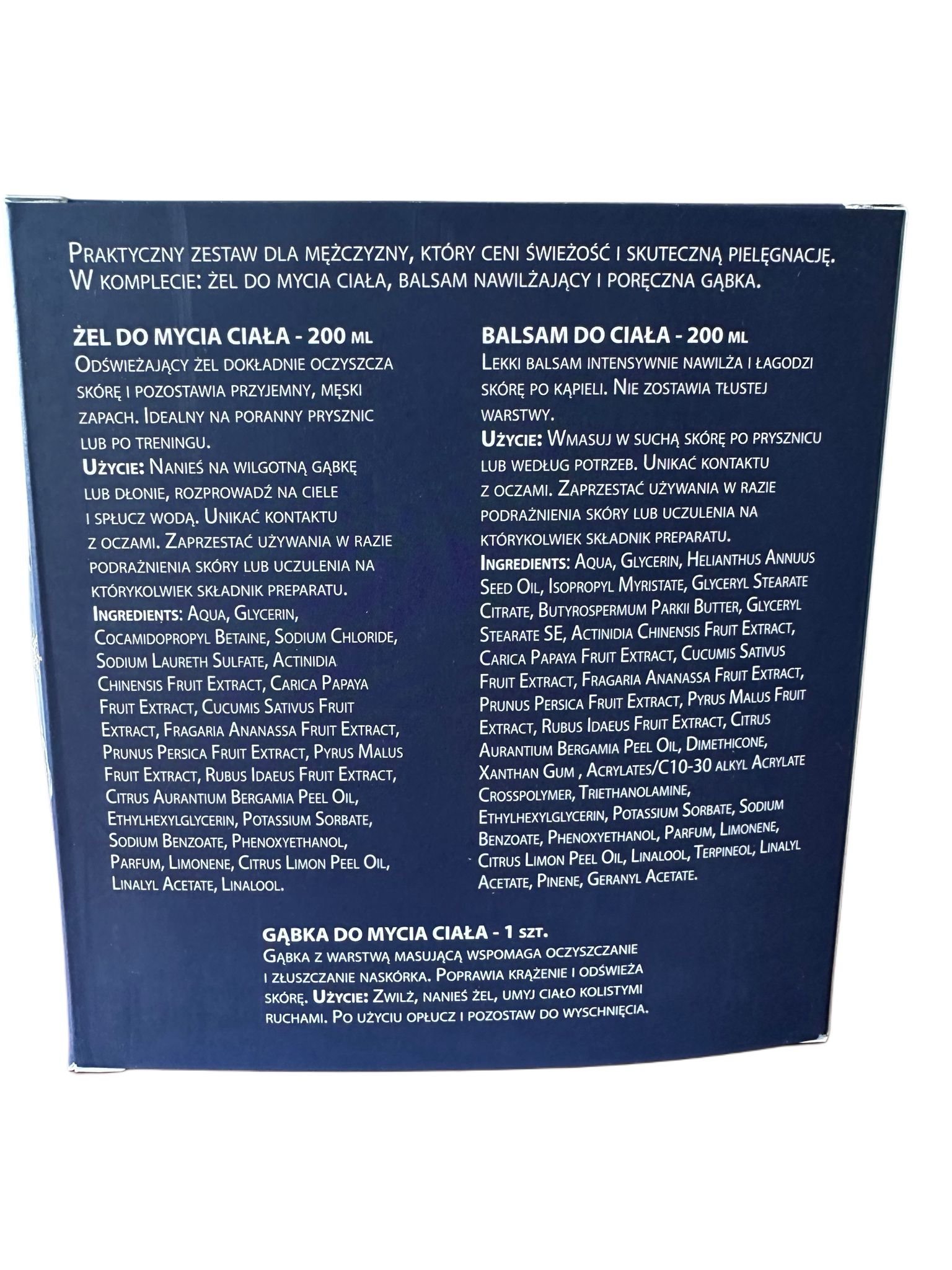 Praktyczny zestaw dla mężczyzny, który ceni świeżość i skuteczną pielęgnację. W komplecie: żel do mycia ciała, balsam nawilżający i poręczna gąbka.