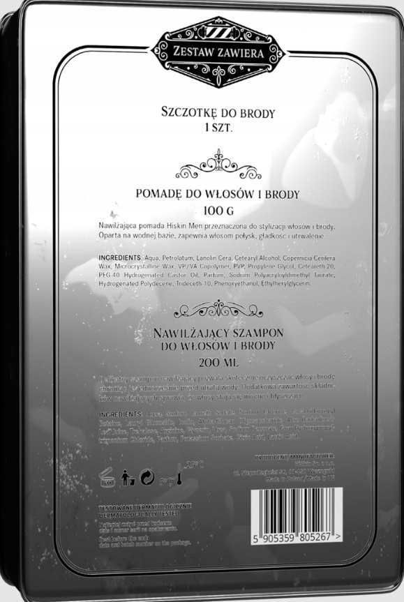 • Pomadę do włosów i brody – nawilżająca pomada przeznaczona do stylizacji włosów i brody . Oparta na wodnej bazie , zapewnia włosom połysk , gładkość i utrwalenie .
