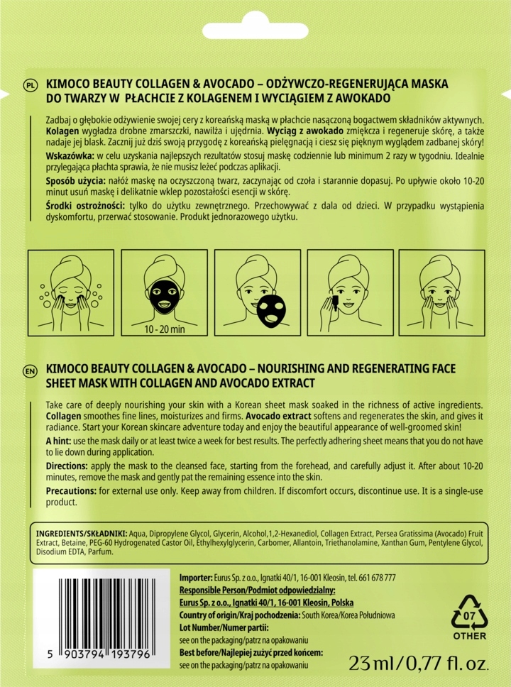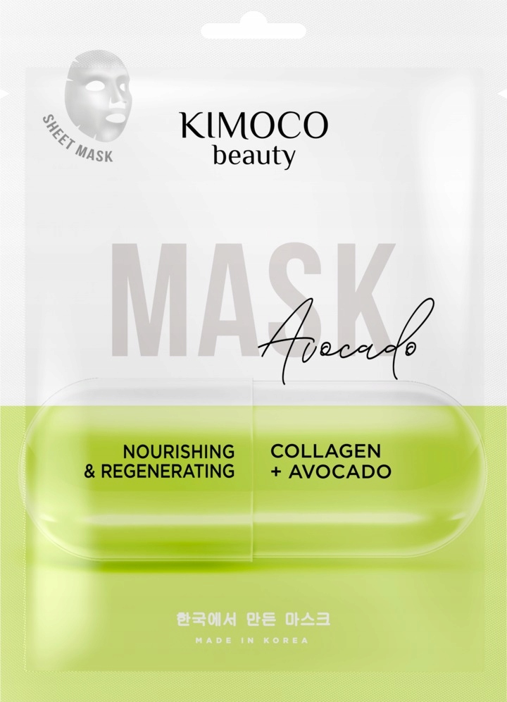 Kimoco Beauty Collagen&Avocado odżywczo – regenerująca maska do twarzy w płachcie z kolagenem i wyciągiem z awokado.