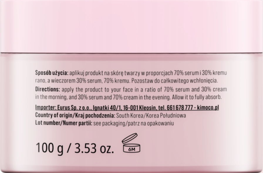 Aplikuj produkt na skórę twarzy w proporcjach 70% serum i 30% kremu rano, a wieczorem 30% serum, 70% kremu. Pozostaw do całkowitego wchłonięcia.