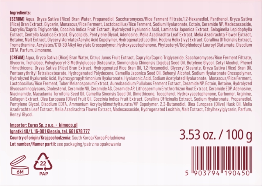 Krem: Aqua, Oryza Sativa (Rice) Bran Water, Citrus Junos Fruit Extract, Caprylic/Capric Triglyceride, Saccharomyces/Rice Ferment Filtrate, Glycerin, Trehalose, Polyglyceryl-3 Methylglucose Distearate, Simmondsia Chinensis (Jojoba) Seed Oil, Butylene Glycol, Cetyl Alcohol, Phenyl Trimethicone, Oryza Sativa (Rice) Bran Extract, Hydrogenated Rice Bran Oil, 1,2-Hexanediol, Glyceryl Stearate, Oryza Sativa (Rice) Bran Oil, Pentaerythrityl Tetraisostearate, Hydrogenated Polydecene, Camellia Japonica Seed Oil, Behenyl Alcohol, Monascus/Rice Ferment, Lactobacillus/Rice Ferment, Tuber Melanosporum Extract, Aureobasidium Pullulans Ferment Extract, Ceramide NP, Ectoin, Betaine, Hydrolyzed Glycosaminoglycans, Cholesterol, Ceramide NG, Ceramide AS, Ceramide AP, Bixa Orellana Seed Oil, Sodium Hyaluronate Crosspolymer, Hydrolyzed Hyaluronic Acid, Tocopherol, Hydroxypropyltrimonium Hyaluronate, Hyaluronic Acid, Sodium Acetylated Hyaluronate, Ceramide EOP, Adenosine, Niacinamide, Macadamia Ternifolia Seed Oil, Camellia Sinensis Seed Oil, Collagen Extract, Helianthus Annuus (Sunflower) Seed Oil, Olea Europaea (Olive) Fruit Oil, Hydroxyacetophenone, Carbomer, Arginine, Dimethicone, Parfum, Sodium Hyaluronate, Propanediol, Pentylene Glycol, Disodium EDTA, Ammonium Acryloyldimethyltaurate/VP Copolymer, 2,3-Butanediol, Melia Azadirachta Flower Extract, Olea Europaea (Olive) Husk Oil, Ocimum Sanctum Leaf Extract, Ethylhexylglycerin, Melia Azadirachta Leaf Extract, Madecassoside, Hydrogenated Lecithin, Glycine Soja (Soybean) Oil, Malt Extract, Curcuma Longa Root Extract, Corallina Officinalis Extract, Benzyl Glycol.