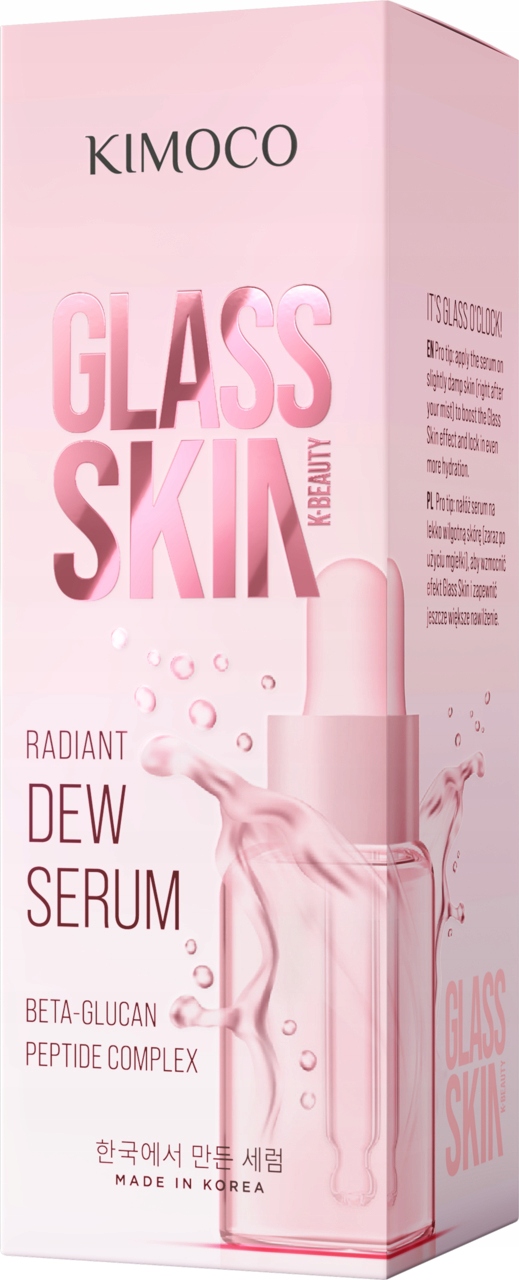 Skoncentrowane serum rozświetlające do twarzy Kimoco Glass Skin z beta-glukanem oraz kompleksem peptydów. Zapewnia natychmiastowy efekt zdrowej, „szklanej” skóry.