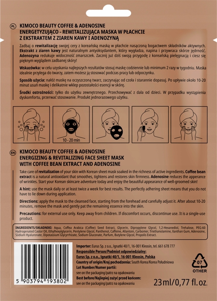 Energetyzująco – rewitalizująca maska w płachcie z ekstraktem z ziaren kawy i adenozyną