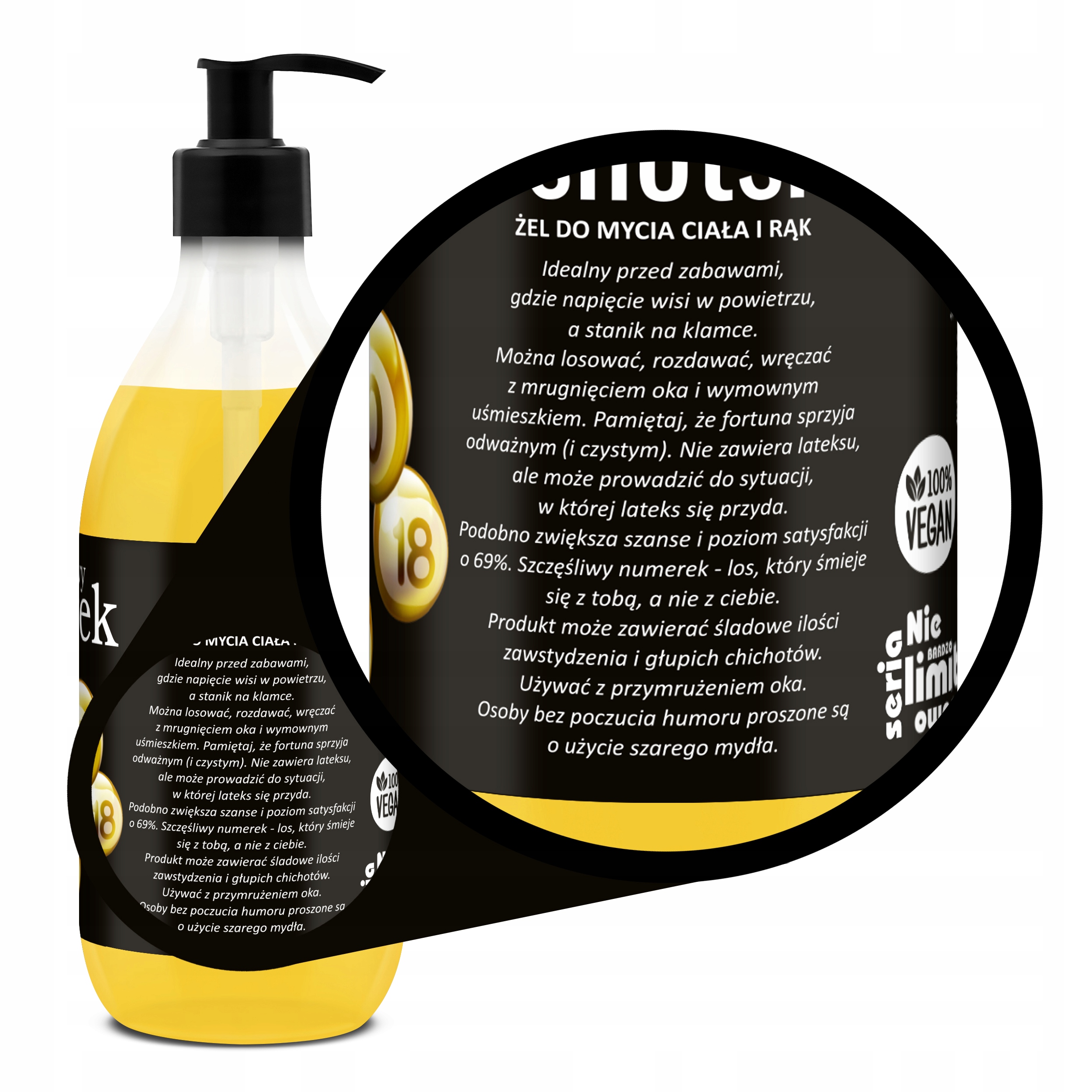 Żel pod prysznic Shots! SZCZĘŚLIWY NUMEREK 500 ml – wegański i naturalny żel pod prysznic Shots! – taki fajny, radośnie żółty. A do tego – być może wbrew wszystkiemu, co widzisz i czytasz na jego etykiecie – świetnie pachnący.