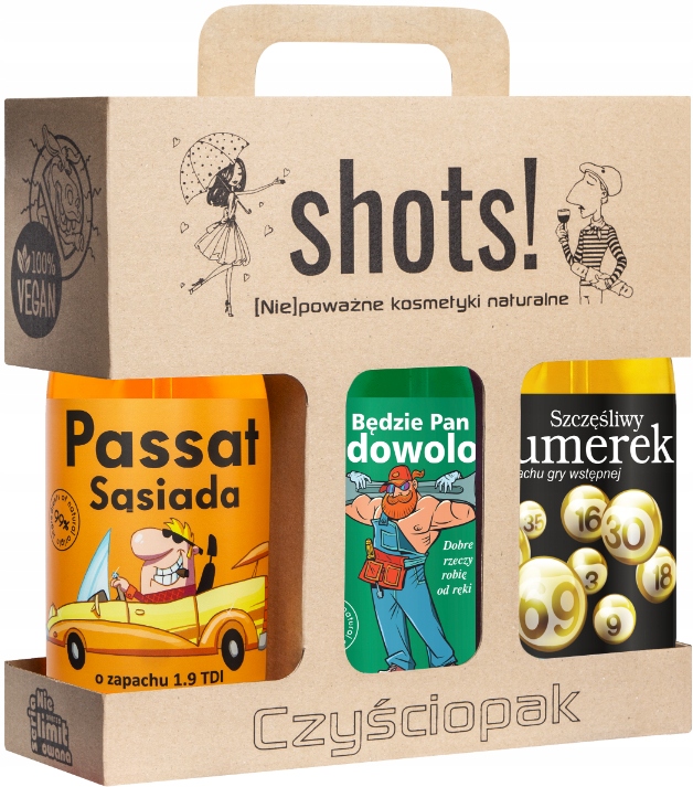 Co jest lepsze na prezent niż pół litra? Półtora litra! Szukasz prezentu dla faceta na urodziny? A może interesuje Cię pomysł na niebanalny prezent dla kumpla na imieniny? Upominek na Dzień Chłopaka, podarunek na święta? Jesteś we właściwym miejscu, bowiem na prezent dla mężczyzny nadaję się idealnie! W szczególności dlatego, że jestem zapakowany w efektowne pudełko prezentowe z okienkami i wygodnym uchwytem. Poza tym, z uwagi na różnorodność zapachową i zabawne etykiety mogę śmiało zapewnić Cię, że szaleństwo zmysłów i zadowolenie obdarowanego masz murowane!