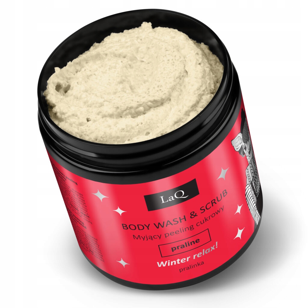 Oto ja, naturalny i wegański cukrowy peeling myjący o działaniu ujędrniająco-antycellulitowym. Mam niezwykle przyjemną w stosowaniu konsystencję lekkiego musu. Świetnie się pienię, dzięki czemu stanowię genialną alternatywę dla żelu pod prysznic. Pachnę błogim spokojem i wytchnieniem – rozpoznasz we mnie pyszną pralinkę.