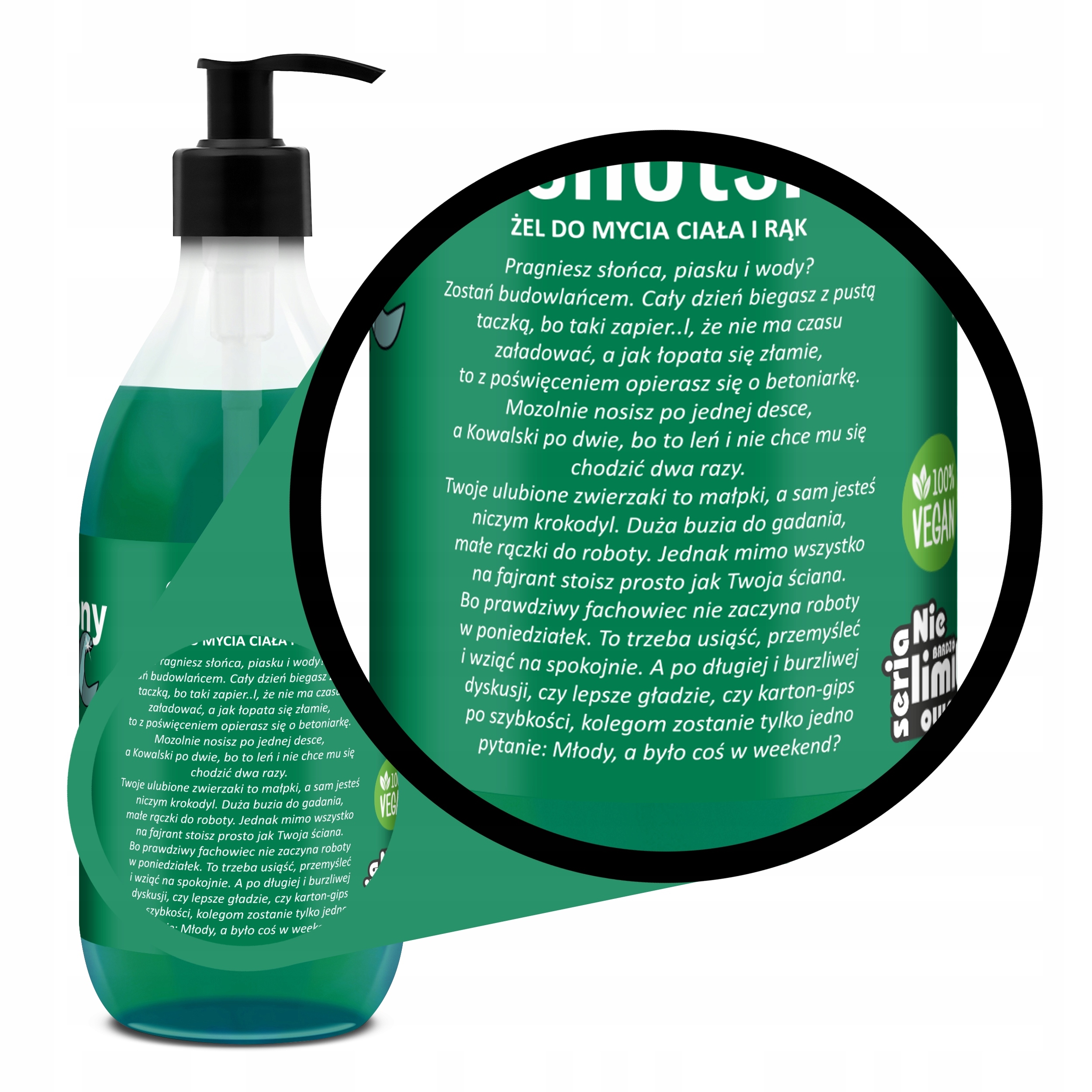 Mój skład jest lepszy niż taczka z premią i niespodziewany fajrant! Zawieram, proszę ciebie, ekstrakty z rozmarynu, rumianku, arniki, szałwii, jasnoty białej, sosny zwyczajnej, rzeżuchy wodnej, łopianu, bluszczu, nagietka i nasturcji. Działają one na skórę m.in. odświeżająco, tonizująco i ściągająco. Wspomagają mikrokrążenie skóry, a także regenerują ją, koją i łagodzą podrażnienia. Za oczyszczanie odpowiada substancja myjąca z oleju kokosowego, a za nawilżaniem i ochroną przed wysuszeniem stoi gliceryna i emolient. Jak to mawiają rdzenni budowlańcy, nie ważne czy prosto, czy krzywo, ważne, żeby było równo! A budowa to nie apteka i lepiej byście tego z młodym nie wytegowali. Skład petarda.