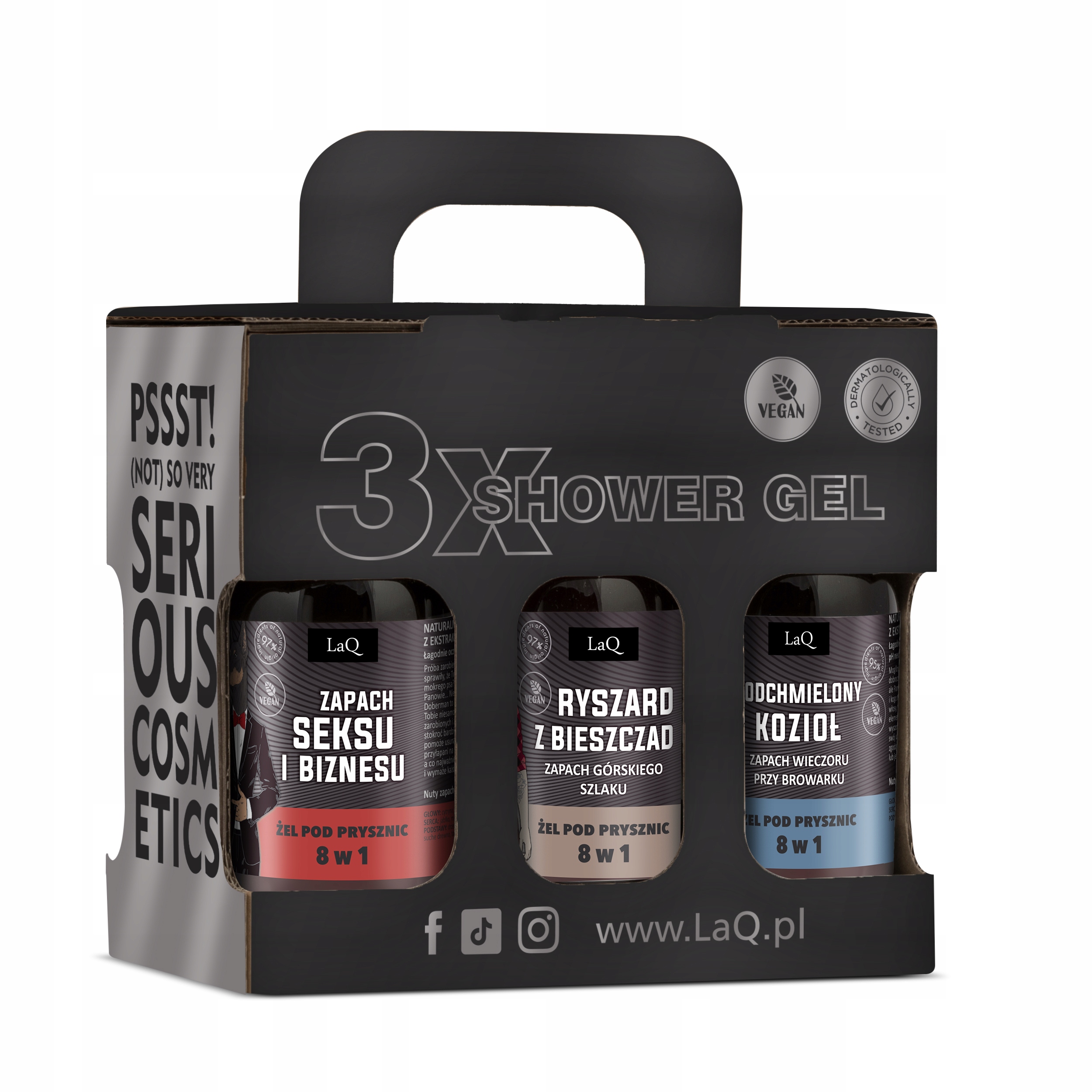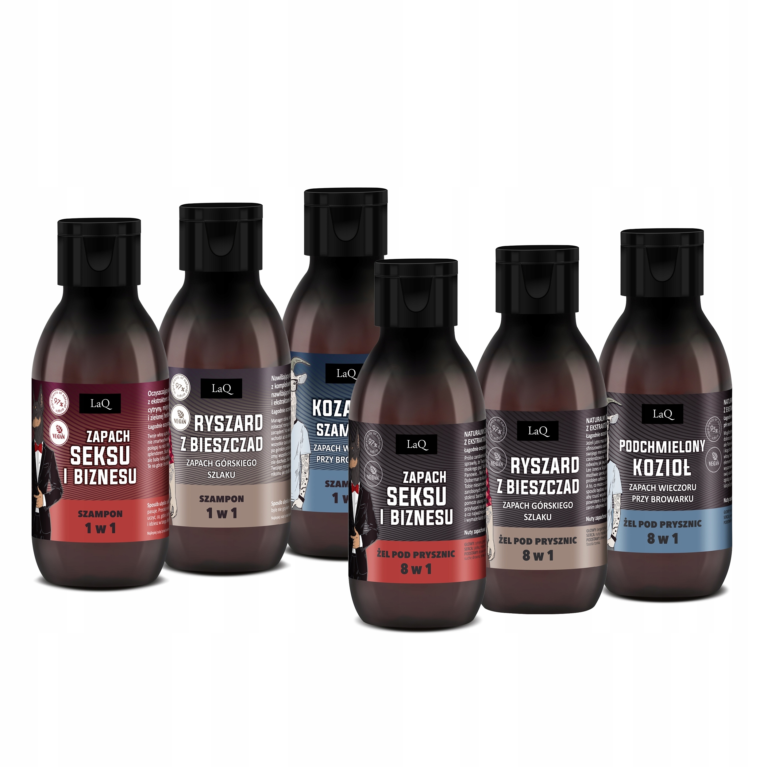 Poznaj zestaw 6 naturalnych i wegańskich kosmetyków dla mężczyzn LaQ w wersji mini: 3 żeli pod prysznic oraz 3 szamponów do włosów. Każdy set żel + szampon reprezentuje jedną z 3 męskich linii zapachowych. Dlatego też Szczęściopak kapitalnie sprawdzi się w roli prezentu dla prawdziwego faceta! Poza tym buteleczki mają bardzo praktyczną pojemność (100 ml), dzięki czemu będą idealne na podróż, siłownię czy basen.