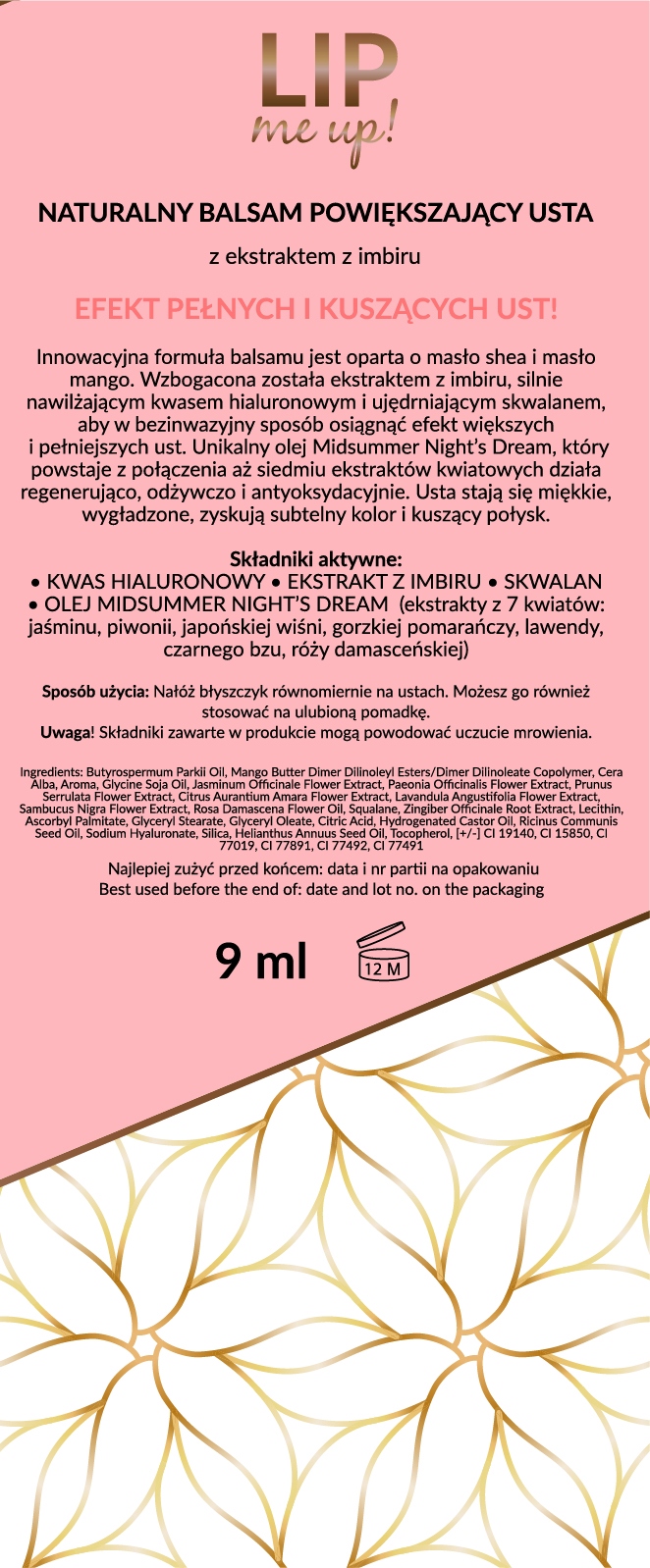 Innowacyjna formuła balsamu, oparta o masło shea i masło mango, wzbogacona została ekstraktem z imbiru, silnie nawilżającym kwasem hialuronowym i ujędrniającym skwalanem, aby w bezinwazyjny sposób osiągnąć efekt większych i pełniejszych ust. Unikalny olejek Midsummer Night’s Dream, który powstaje z połączenia aż 7 ekstraktów kwiatowych działa regenerująco, odżywczo i antyoksydacyjnie. Usta stają się miękkie, wygładzone, zyskują subtelny kolor i kuszący połysk.