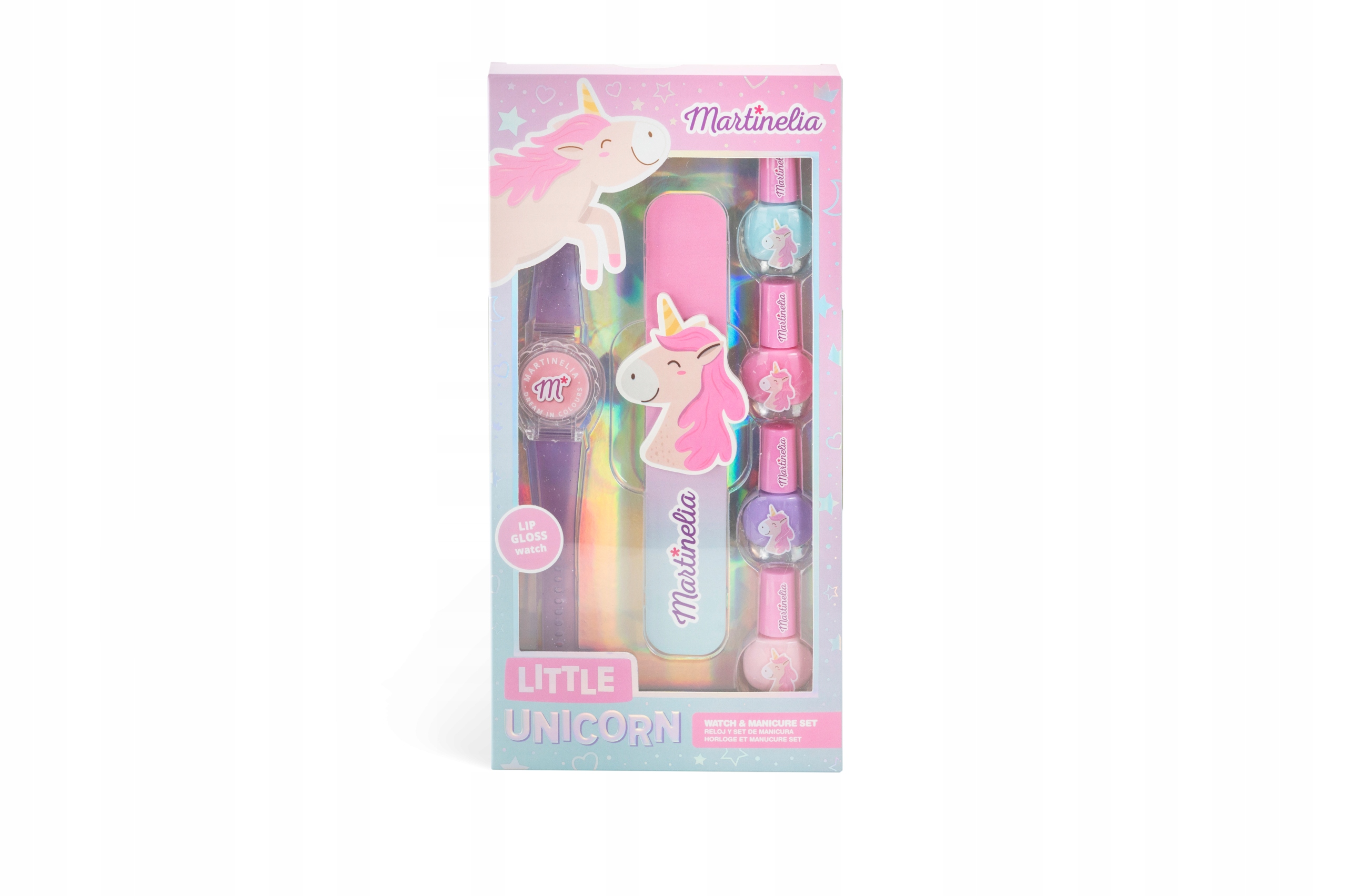 Little Unicorn Watch & Manicure Set zestaw uroczy zegarek z błyszczykiem + lakier do paznokci 4szt + pilnik Martinelia