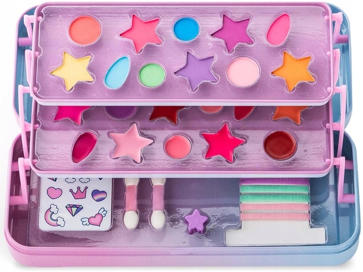 Zestaw kosmetyków dla dzieci zawiera: 11 cieni do powiek, 11 błyszczyków, 2 aplikatory, naklejki, 2 gumki do włosów i dwie spinki