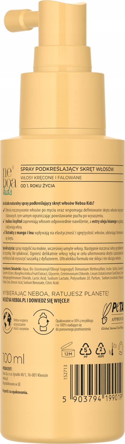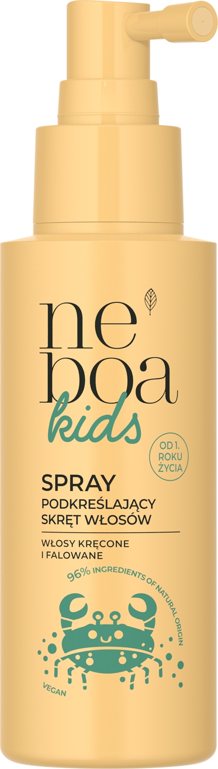 Spray podkreślający skręt włosów dla dzieci Neboa Kids przeznaczony dla najmłodszych, od 1. roku życia. Przeznaczony do włosów kręconych i falowanych. Ułatwia rozczesywanie włosów po myciu oraz pomaga zdefiniować skręt bez efektu puchu.