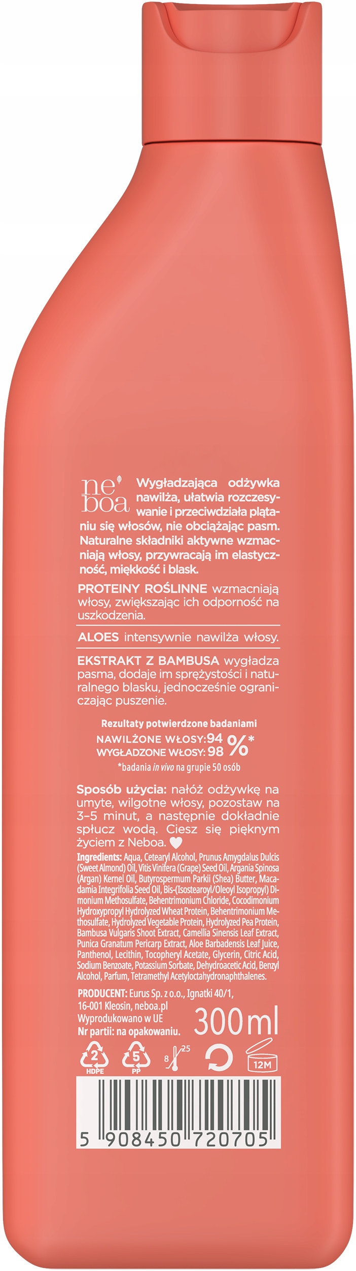 Sposób użycia: Nałóż odżywkę na umyte, wilgotne włosy, pozostaw na 3–5 minut, a następnie dokładnie spłucz wodą.