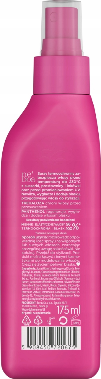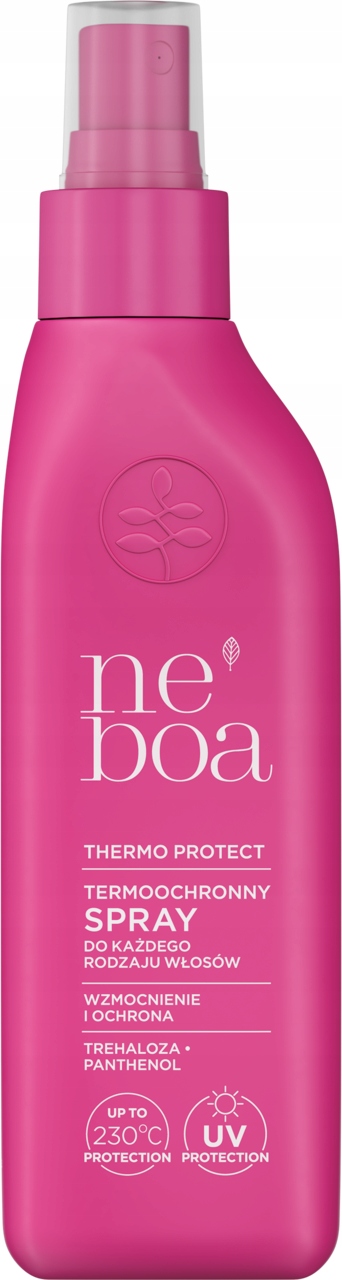 Wzmacniający spray termoochronny Neboa, który zabezpiecza włosy przed wysoką temperaturą suszarki, prostownicy i lokówki do 230°C oraz promieniowaniem UV.