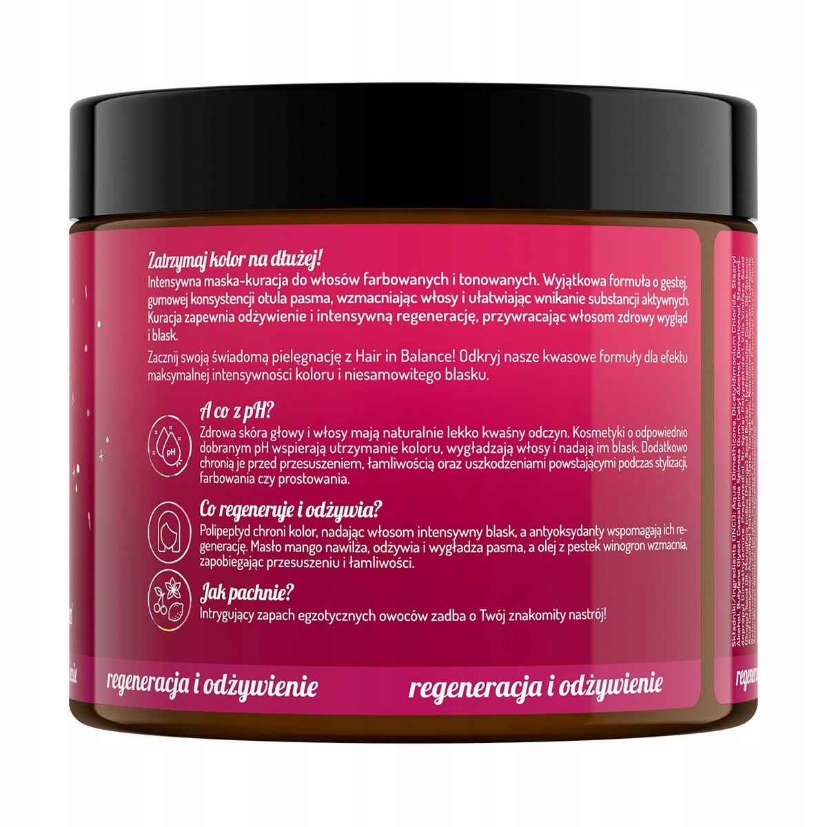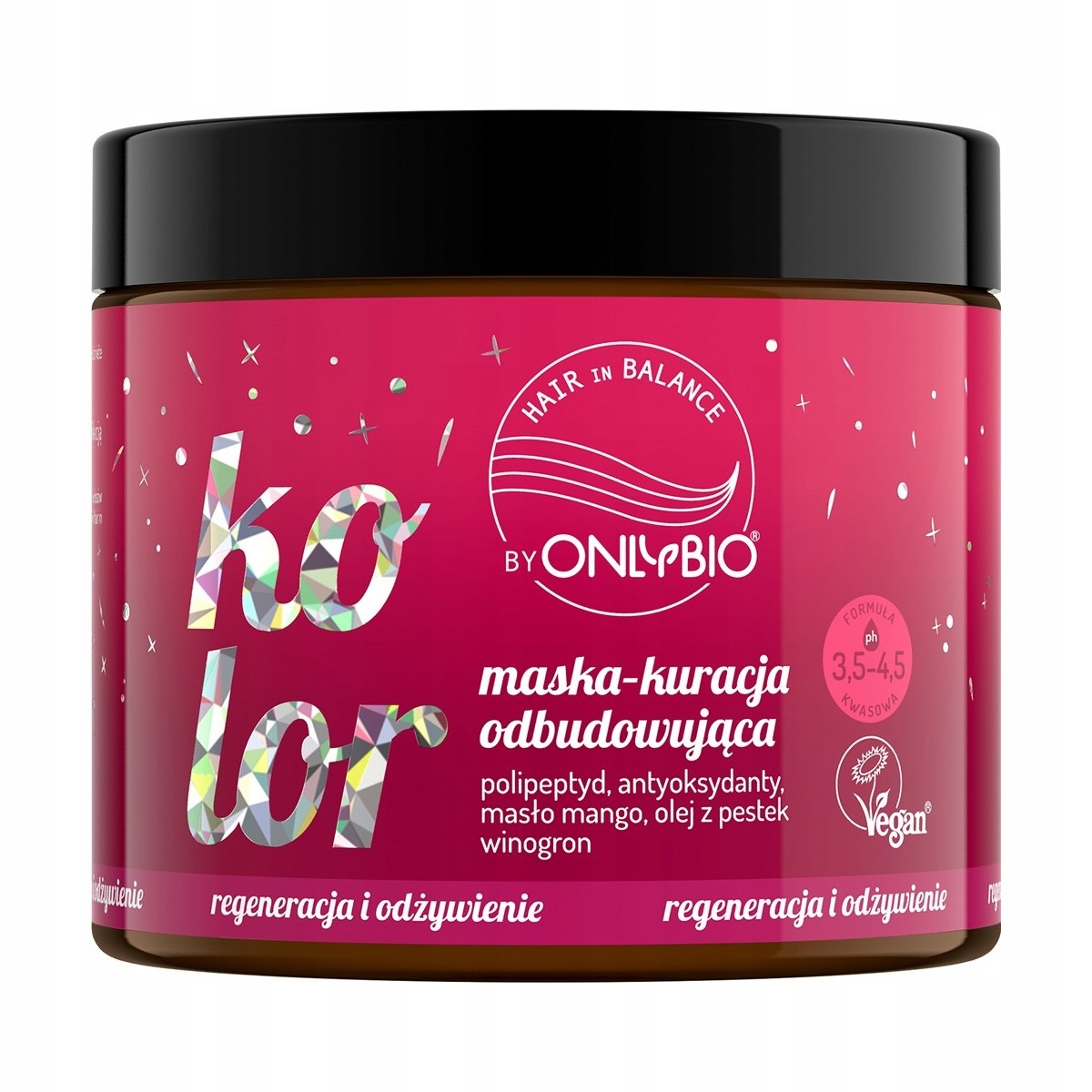 Maska-kuracja odbudowująca do włosów farbowanych i tonowanych Onlybio Hair Balance Kolor o kwasowej formule oraz intrygującym zapachu owoców egzotycznych. Wzbogacona polipeptydem, antyoksydantem, masłem mango oraz olejem z pestek winogron.