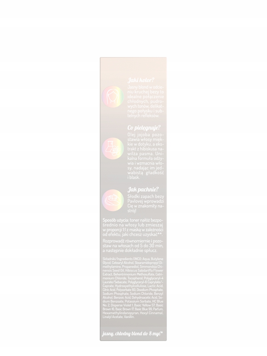 • Toner błyskawicznie i skutecznie nadaje chłodny, jasnobeżowy kolor włosów w odcieniu bezy Pavlova, zapewniając subtelny połysk i delikatne refleksy.