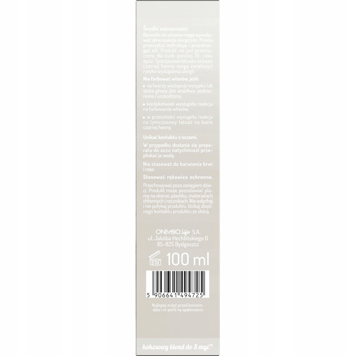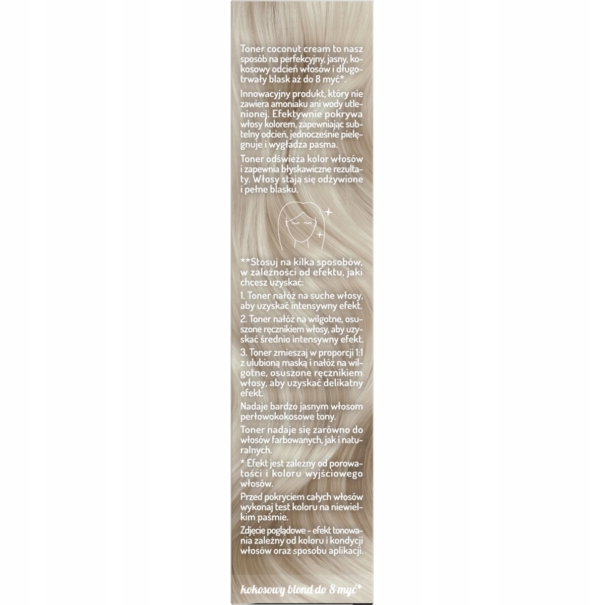 Toner OnlyBio o zapachu kremu kokosowego nie zawiera amoniaku ani wody utlenionej, a jasny, kokosowy odcień utrzymuje się do 8 myć.