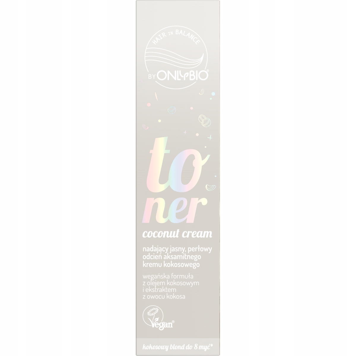 Toner do włosów Coconut Cream Hair In Balance by OnlyBio odświeżający kolor i nadający jasny perłowy odcień aksamitnego kremu kokosowego z subtelnymi refleksami.