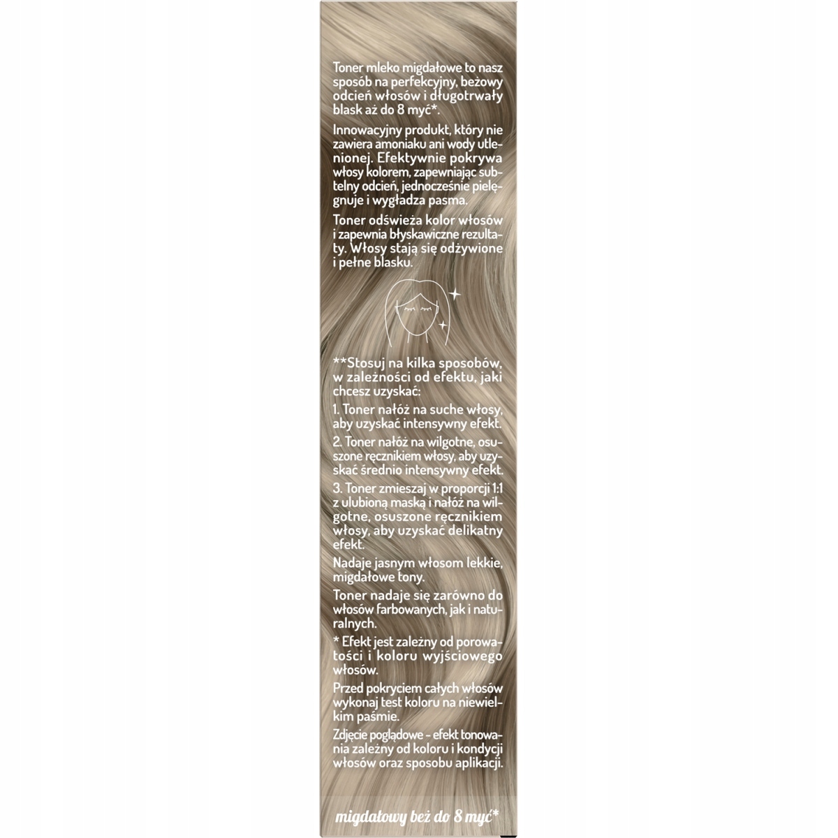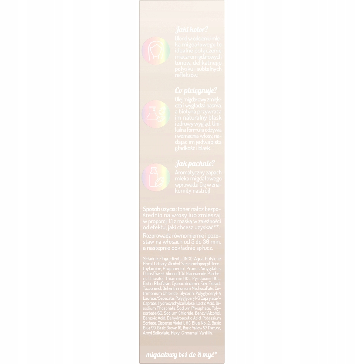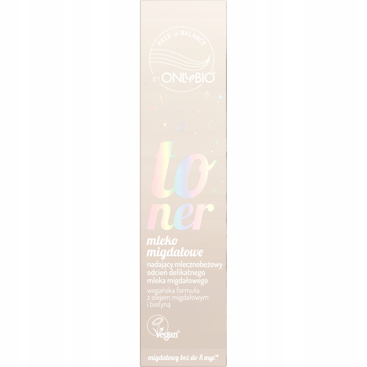 Toner do włosów Mleko Migdałowe Hair In Balance by OnlyBio odświeżający kolor i nadający mlecznobeżowy odcień aksamitnego mleka migdałowego z subtelnymi refleksami.