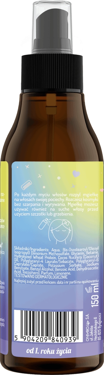 Sposób użycia: Rozpyl mgiełkę na mokre lub suche włosy dziecka i je rozczesz.