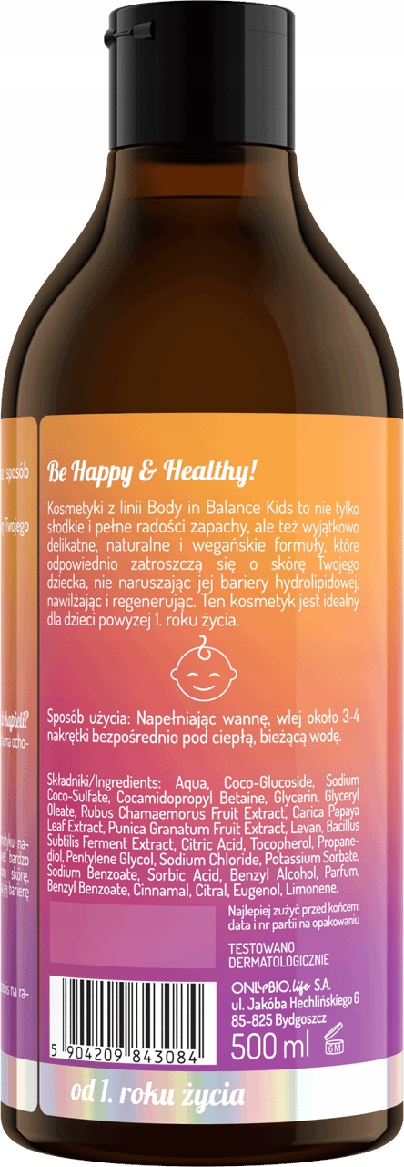 Kosmetyki z linii Body in Balance Kids to nie tylko słodkie i pełne radości zapachy, ale też wyjątkowo delikatne, naturalne i wegańskie formuły, które odpowiednio  zatroszczą się o skórę Twojego dziecka, nie naruszając jej bariery hydrolipidowej, nawilżając i regenerując. Ten kosmetyk jest idealny dla dzieci powyżej 1. roku życia.