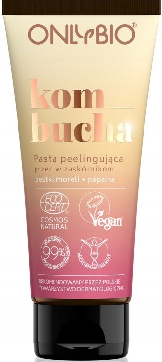 Pasta peelingująca przeciw zaskórnikom z kombuchą od OnlyBio pozwala usunąć martwy naskórek i skutecznie odblokować pory na dwa sposoby: enzymatyczny – dzięki papainie, oraz mechaniczny – dzięki pestkom moreli. Peeling oczyszcza i pobudza komórki do regeneracji.