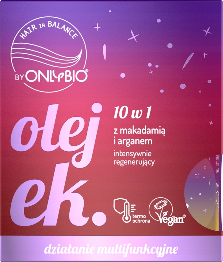 Intensywnie regenerujący olejek do włosów 10w1 od Hair In Balance OnlyBio wzbogacony olejami: makadamia, arganowym oraz moringa.