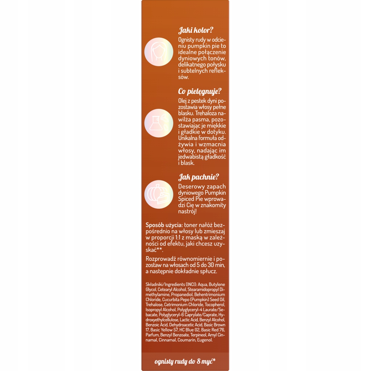 Ognisty rudy w odcieniu pumpkin pie to idealne połączenie dyniowych tonów, delikatnego połysku i subtelnych refleksów.