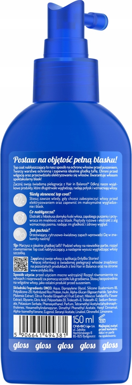 Top coat nabłyszczający to nasz sposób na ochronę włosów przed puszeniem. Tworzy warstwę ochronną i zapewnia idealnie gładką taflę. Chroni przed wilgocią oraz przeciwdziała elektryzowaniu się włosów. Gwarantuje włosom spektakularny blask!