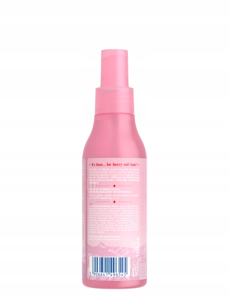 Pachnie przygodą, śmiechem i momentami, które trzeba złapać na stories! It’s time… for berry soft hair! OnlyBio i E.Wedel przeniosą Cię do świata soczystych świąt, gdzie zamiast klasyki jest owocowa zabawa, a zapachy kuszą jak świąteczne słodkości. Wskocz w świąteczny mood z Berry xmas i Fabryką Czekolady E.Wedel! Termoochrona w mgiełce to nasz sposób na zabezpieczenie włosów przed gorącym powietrzem suszarki oraz wysoką temperaturą lokówki i prostownicy.
