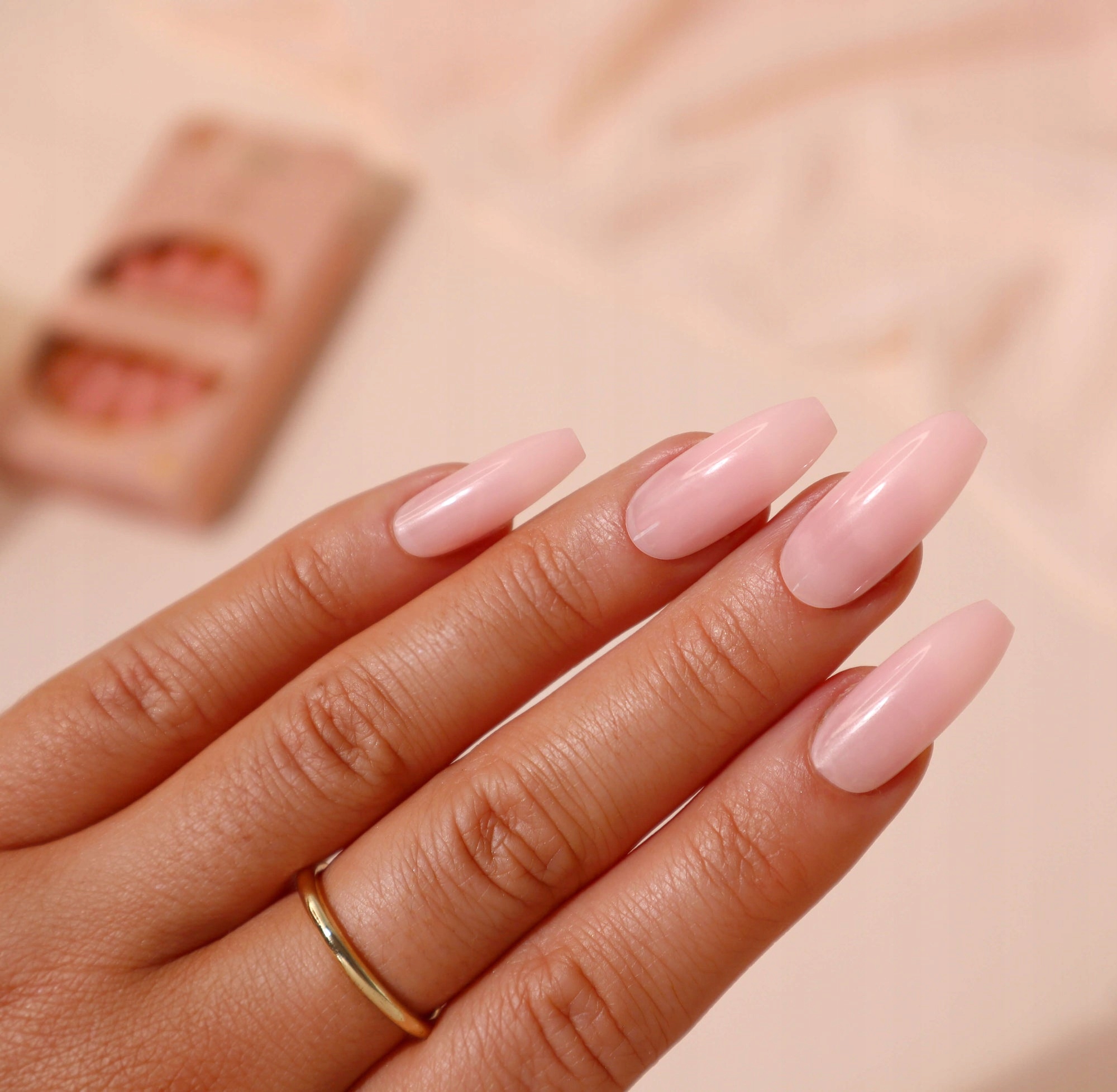 Paznokcie w kolorze NUDE z różowym odcieniem. Kształt baleriny, długie.