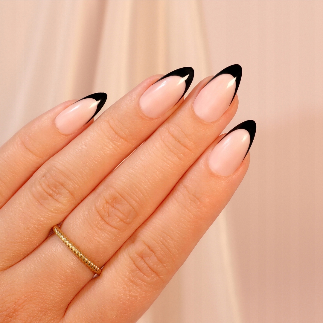 BLACK OUT to jedna z odmian klasycznego francuskiego manicure. To piękne paznokcie w kolorze nude ze stylowymi czarnymi końcówkami. Idealne na co dzień 🙂