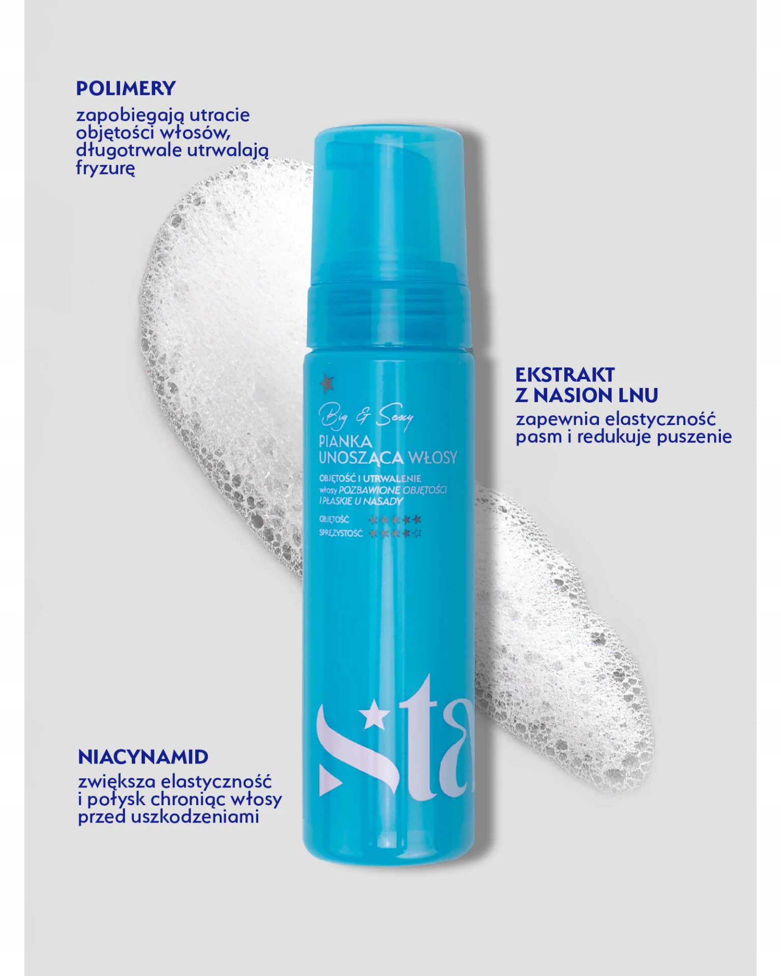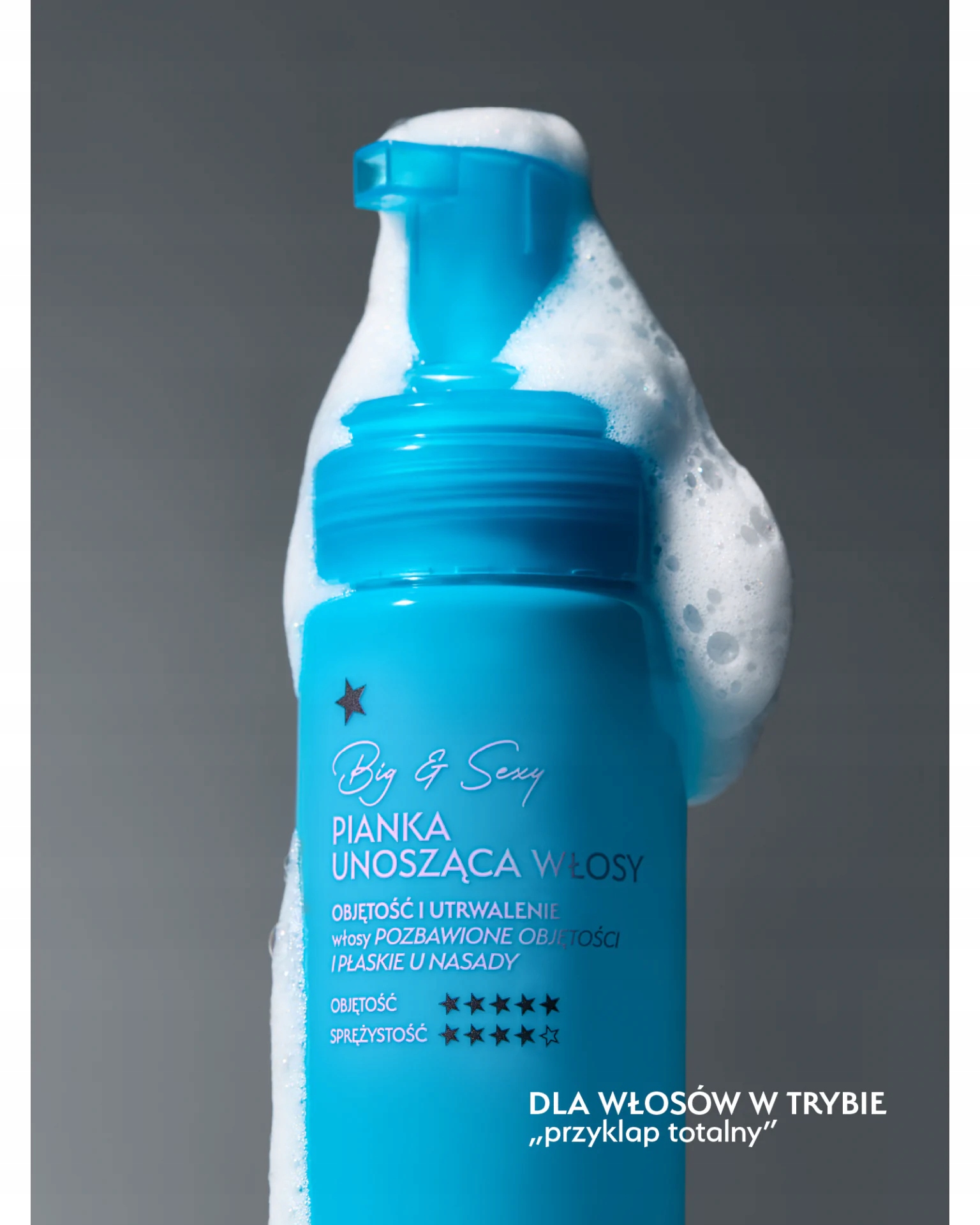Unosząca włosy od nasady formuła pianki Big & Sexy zapewnia efekt trwałej objętości. Ekstrakt z nasion lnu i niacynamid wygładzają, redukują puszenie oraz nadają pasmom elastyczność.
