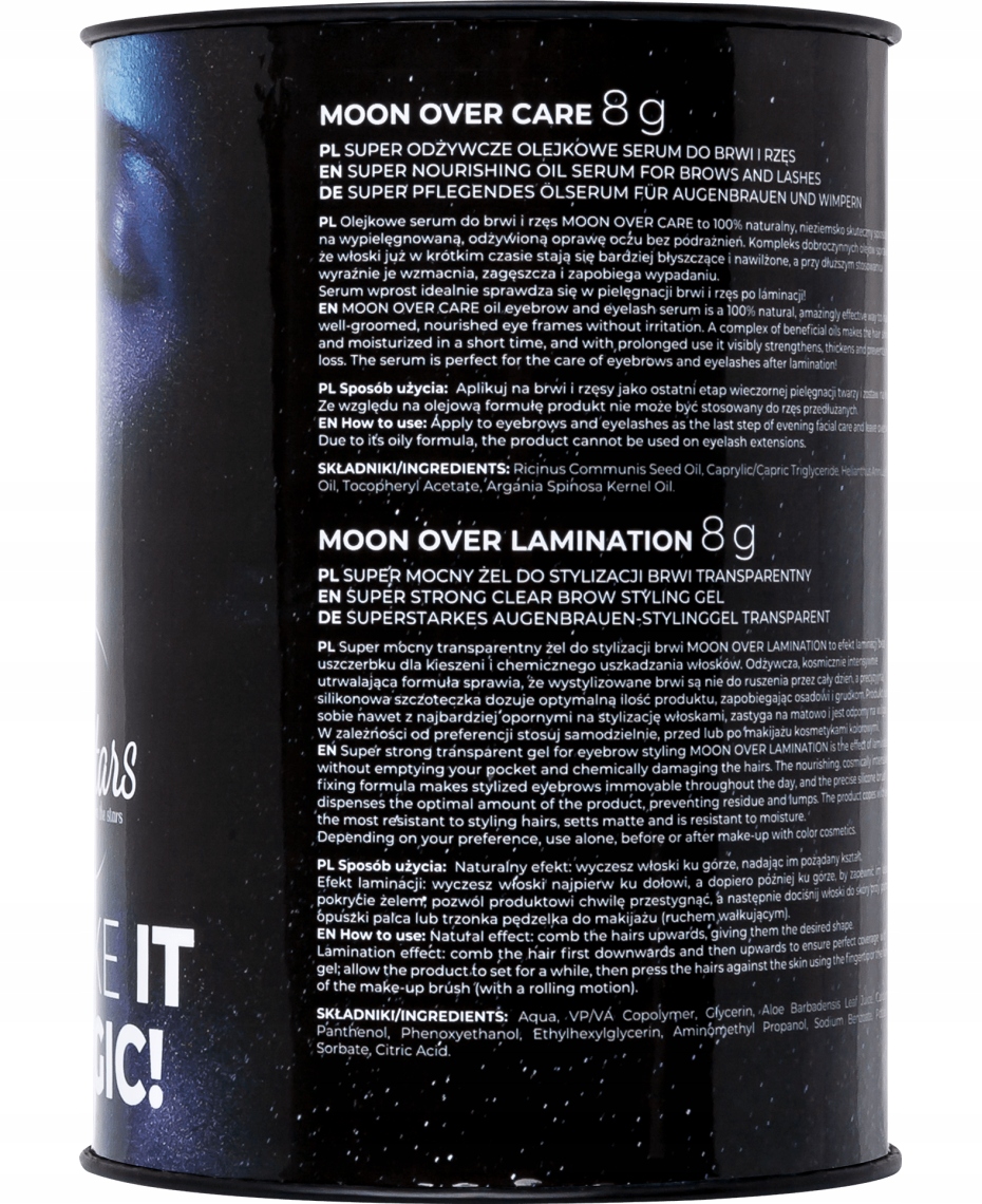 Olejkowe serum do brwi i rzęs MOON OVER CARE to 100% naturalny, nieziemsko skuteczny sposób na wypielęgnowaną, odżywioną oprawę oczu bez podrażnień. Kompleks dobroczynnych olejów sprawia, że włoski już w krótkim czasie stają się bardziej błyszczące i nawilżone, a przy dłuższym stosowaniu wyraźnie je wzmacnia, zagęszcza i zapobiega wypadaniu. Serum wprost idealnie sprawdza się w pielęgnacji brwi i rzęs po laminacji!