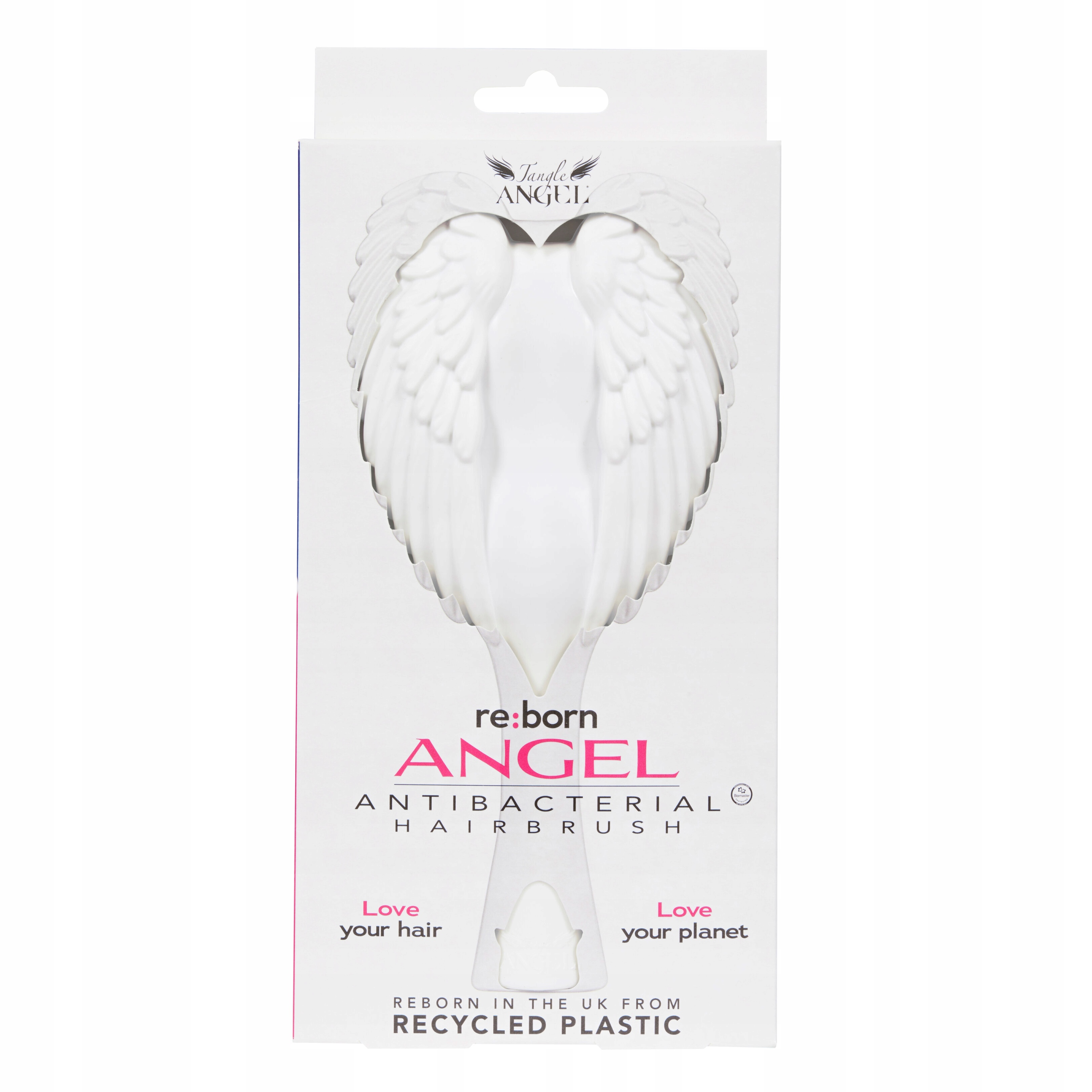 Szczoteczka Tangle Angel Reborn została z dumą zaprojektowana, opracowana i wyprodukowana w Wielkiej Brytanii. Korpus wykonany jest w 100% z plastiku pochodzącego z recyklingu. Włosie Memory — FlexTM jest antybakteryjne i ze względów wydajnościowych wykonane z pierwotnego plastiku. Zarówno szczotka jak opakowanie w 100% nadają się do recyklingu, co czyni je zdrowym wyborem zarówno dla Twoich włosów jak i planety.